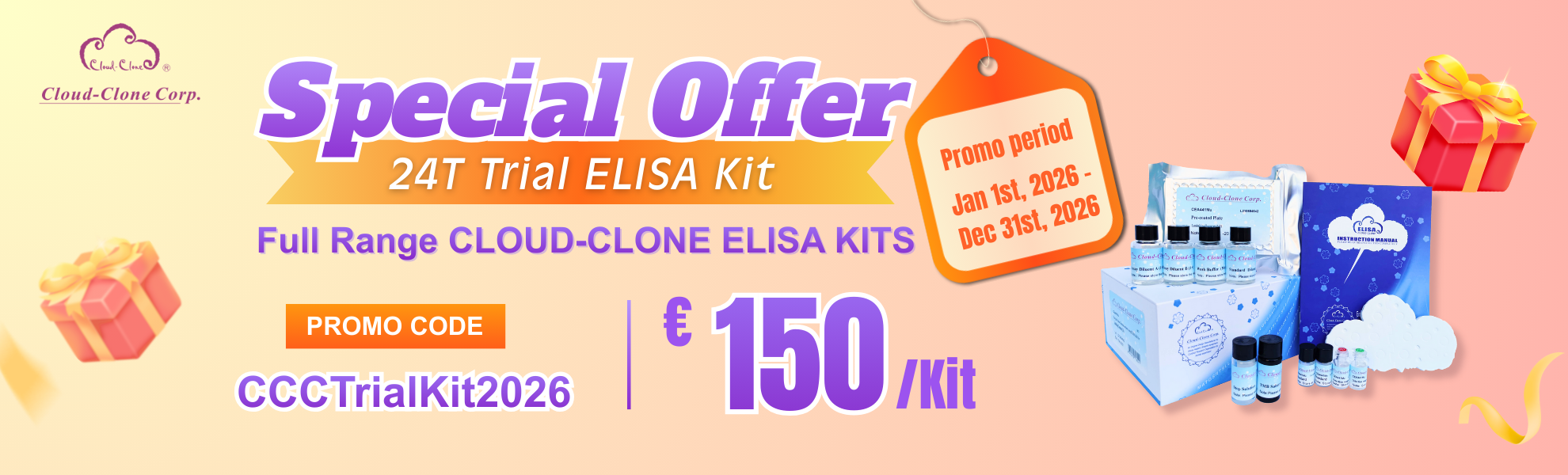 Full range of CLOUD-CLONE ELISA 24T trial kits, covering sandwich, competitive inhibition, and other established formats, are now in stock at an exclusive price of €150/kit, helping accelerate your research projects efficiently.
